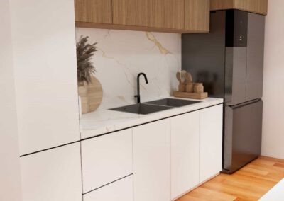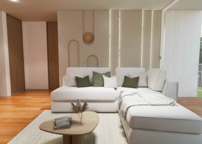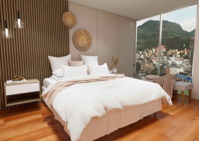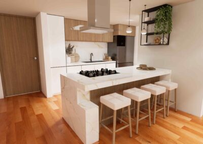 Martha soñaba con un apartamento que transmitiera calidez, sofisticación y un estilo muy personal. Desde el diseño de interiores se propuso un concepto que mezcla tonos terrosos, blancos y madera natural con acentos en negro, logrando un equilibrio entre frescura y elegancia. La idea fue pensar cada espacio no solo en lo estético, sino también en lo práctico: una cocina funcional y acogedora, baños modernos con acabados cálidos, una sala pensada para compartir y habitaciones que reflejen serenidad. Para aprovechar al máximo cada metro, se diseñaron muebles a la medida que aportan almacenamiento inteligente y, al mismo tiempo, se integran como parte de la decoración. El objetivo del proyecto es que cada textura y material elegido dialogue con la personalidad de Martha, creando un hogar premium en Bogotá que inspire, emocione y haga realidad su visión de vida.