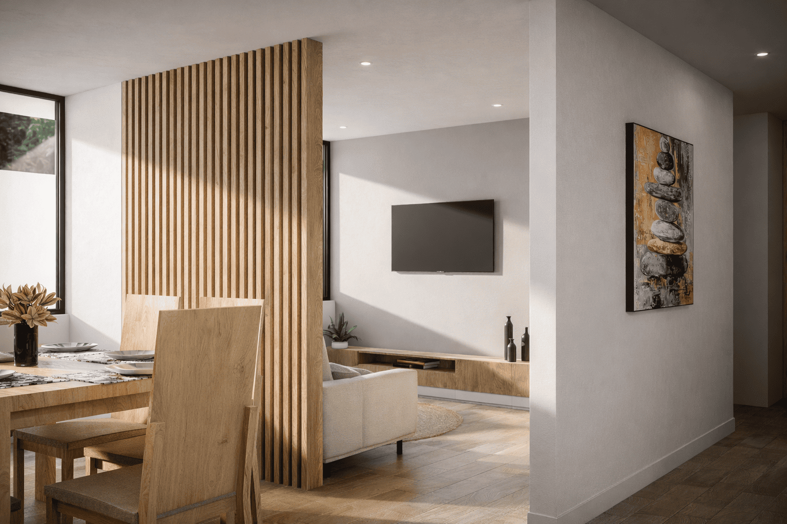 El proyecto propone una vivienda donde el diseño privilegia la sensación de calma y continuidad espacial, creando transiciones suaves entre los ambientes y una experiencia doméstica más fluida. La propuesta combina líneas limpias, elementos orgánicos y una cuidada selección de acabados que aportan ligereza visual y confort sensorial en cada rincón.
