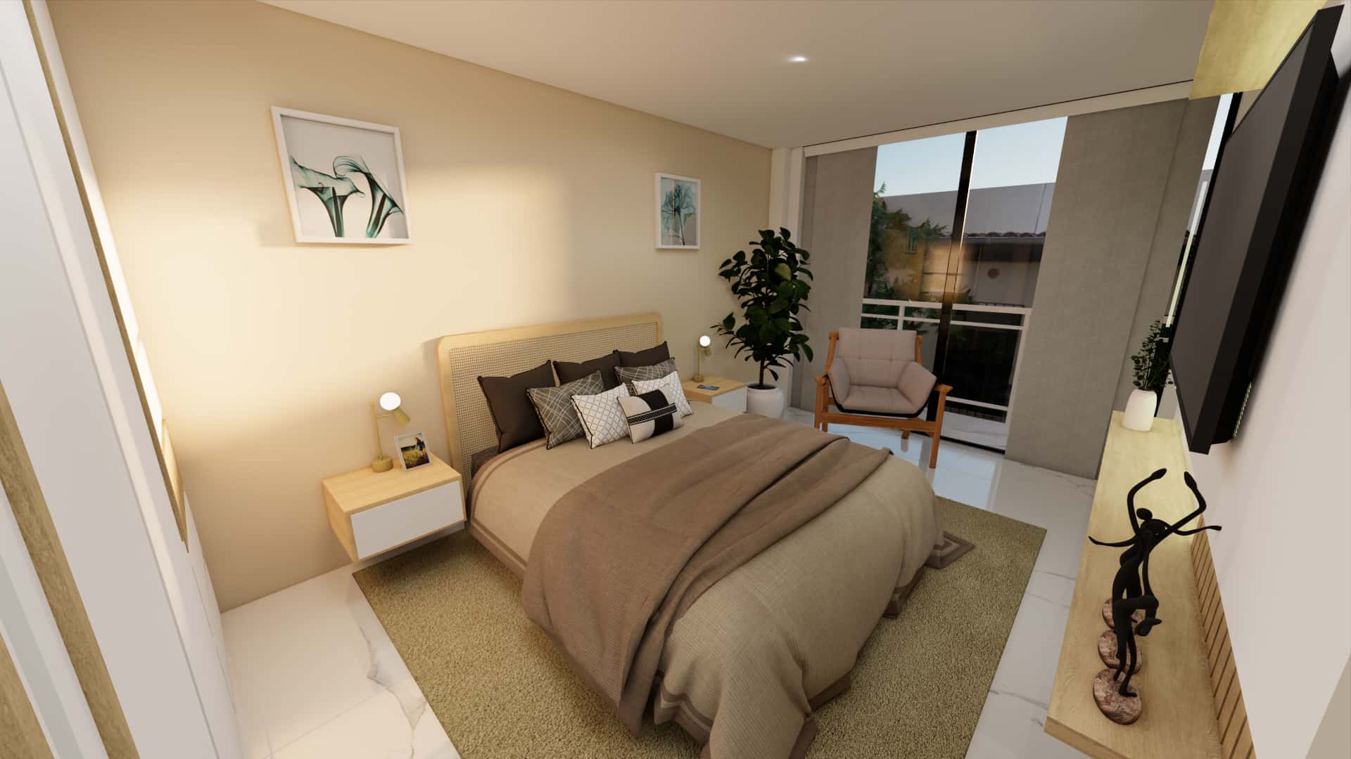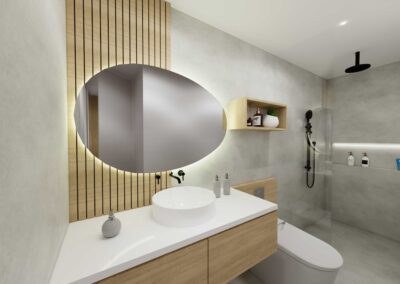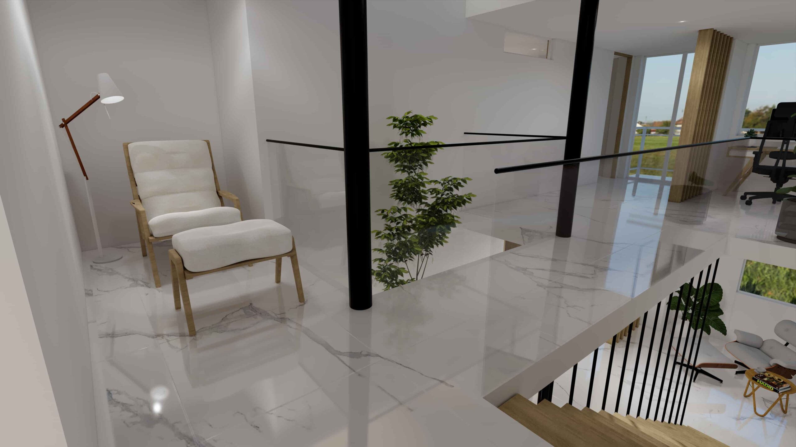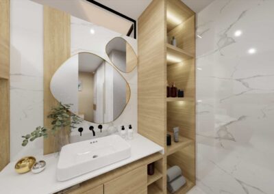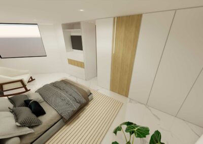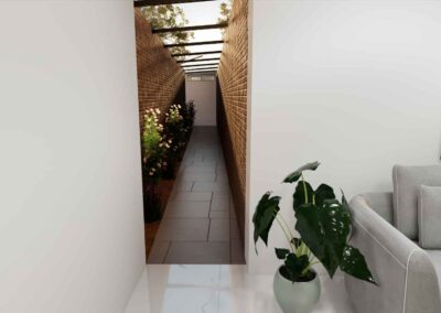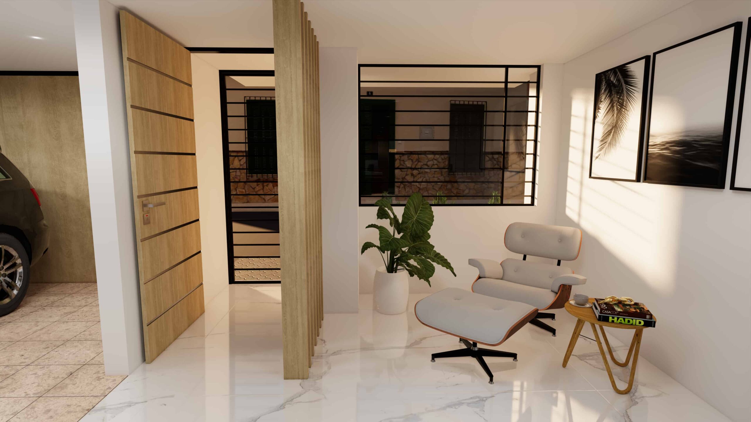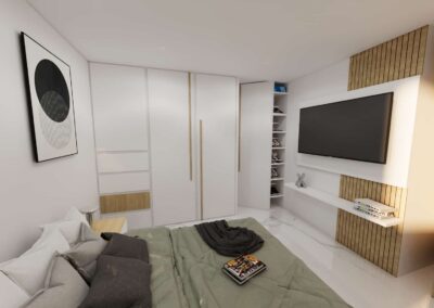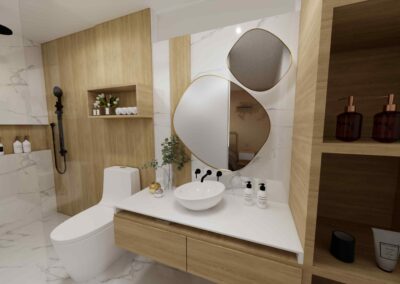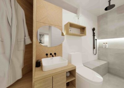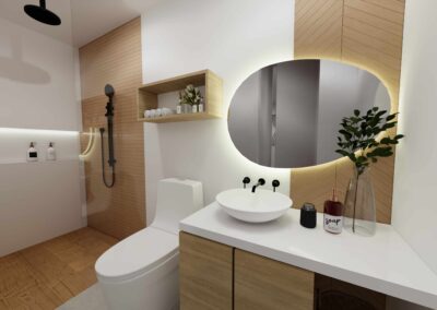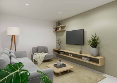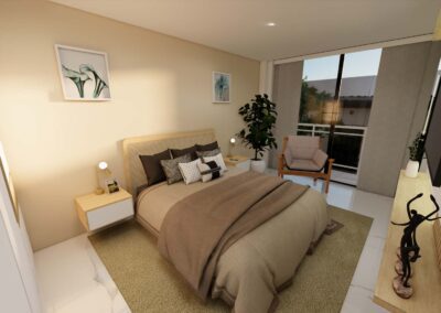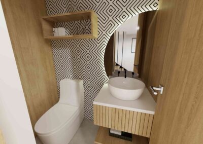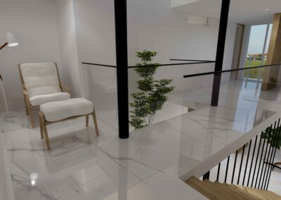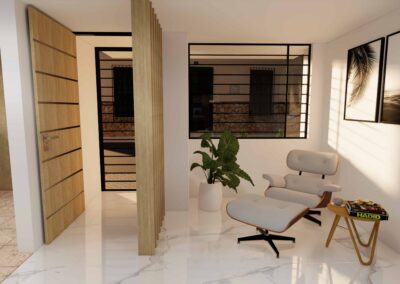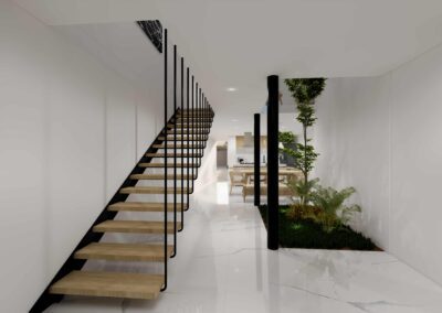 El diseño de interiores de la casa familiar de Alfredo y Katie en Agua de Dios refleja la perfecta unión entre modernidad, calidez y funcionalidad. La fachada contemporánea da la bienvenida a un interior luminoso, con pisos y paredes en blanco que amplifican los espacios y generan una atmósfera fresca y limpia. La madera cálida equilibra y aporta confort en cada rincón, mientras que los mesones en piedra sinterizada de la cocina transmiten elegancia y resistencia. La cocina, amplia y abierta, se integra a la zona social, invitando a compartir momentos en familia. La claraboya a doble altura ilumina el corazón de la casa, resaltando un jardín seco que se convierte en pieza protagonista. Cada detalle del diseño fue pensado para crear un hogar inspirador, lleno de vida, moderno y al mismo tiempo cercano a la esencia de la familia.