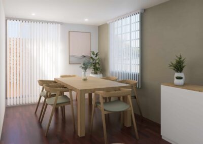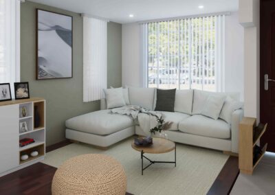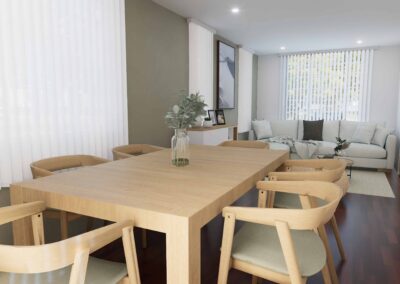 Paula quería que la sala-comedor de su apartamento en arriendo en Bogotá se sintiera realmente como un hogar, pero sin perder la flexibilidad de llevarse todo si en algún momento cambiaba de lugar. Desde el diseño de interiores se propuso mobiliario a medida, práctico y funcional, pensado para adaptarse a cualquier espacio futuro. Para darle vida al ambiente, una de las paredes se planteó en un verde oliva que aporta frescura y personalidad. El mobiliario en madera clara cálida refuerza la sensación acogedora, mientras que los sofás en un tono neutro gris claro equilibran y suavizan la atmósfera. El comedor, también en madera clara, se acompaña de sillas en verde oliva que dialogan con el muro protagonista. El resultado es un espacio versátil, armónico y con carácter, ideal para disfrutar y compartir cada día.