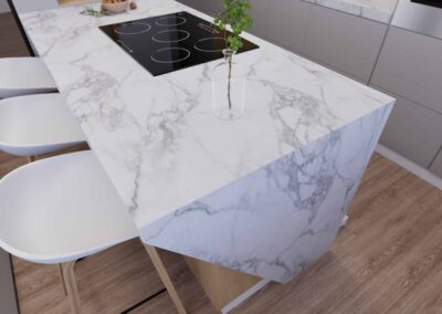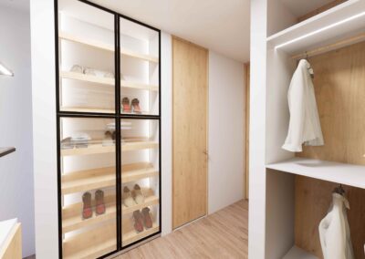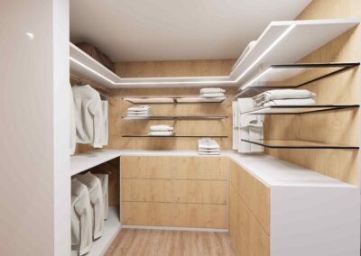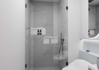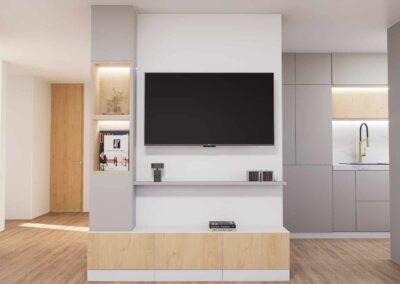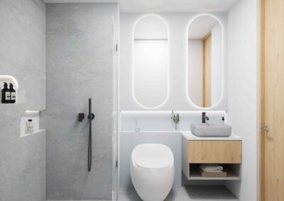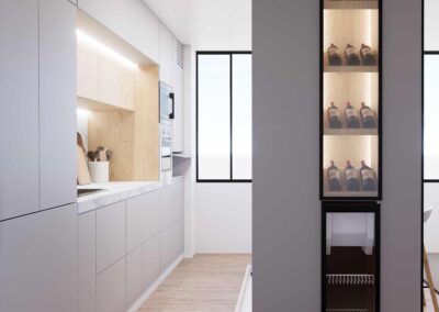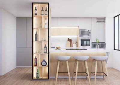 Carlos soñaba con un apartamento moderno, funcional y con un toque sofisticado. Desde el diseño de interiores, la propuesta la centramos en abrir la cocina para integrarla al área social, convirtiéndola en un espacio más amplio y conectado. La isla se pensó como protagonista, no solo por su practicidad, sino porque en ella se camuflaría la columna existente con un elegante botellero de vinos en vidrio e iluminación led, aportando carácter y exclusividad. Los tonos en gris claro junto con la madera cálida fueron propuestos para el mobiliario, creando un equilibrio entre frescura y calidez. Para los baños, sugerimos un enchape en gran formato, tipo cemento pulido en gris oscuro, con luces led estratégicas para elevar la atmósfera. Finalmente, el walk-in closet se rediseñó para aprovechar mejor cada rincón con un mobiliario optimizado y sofisticado.