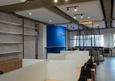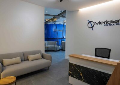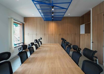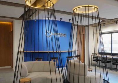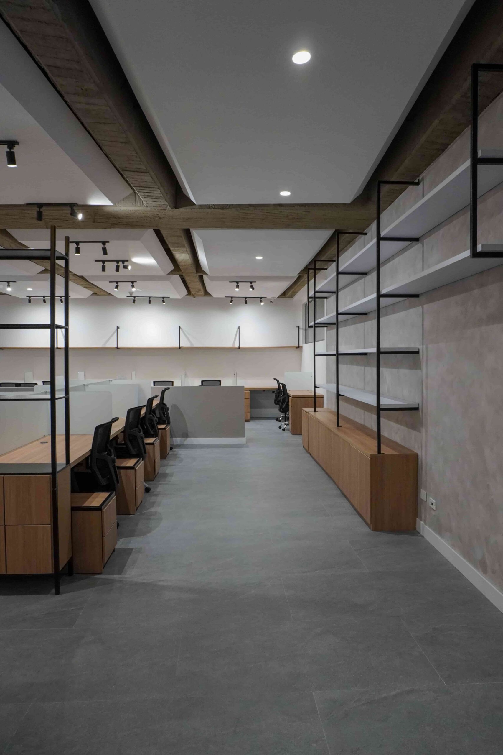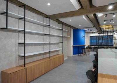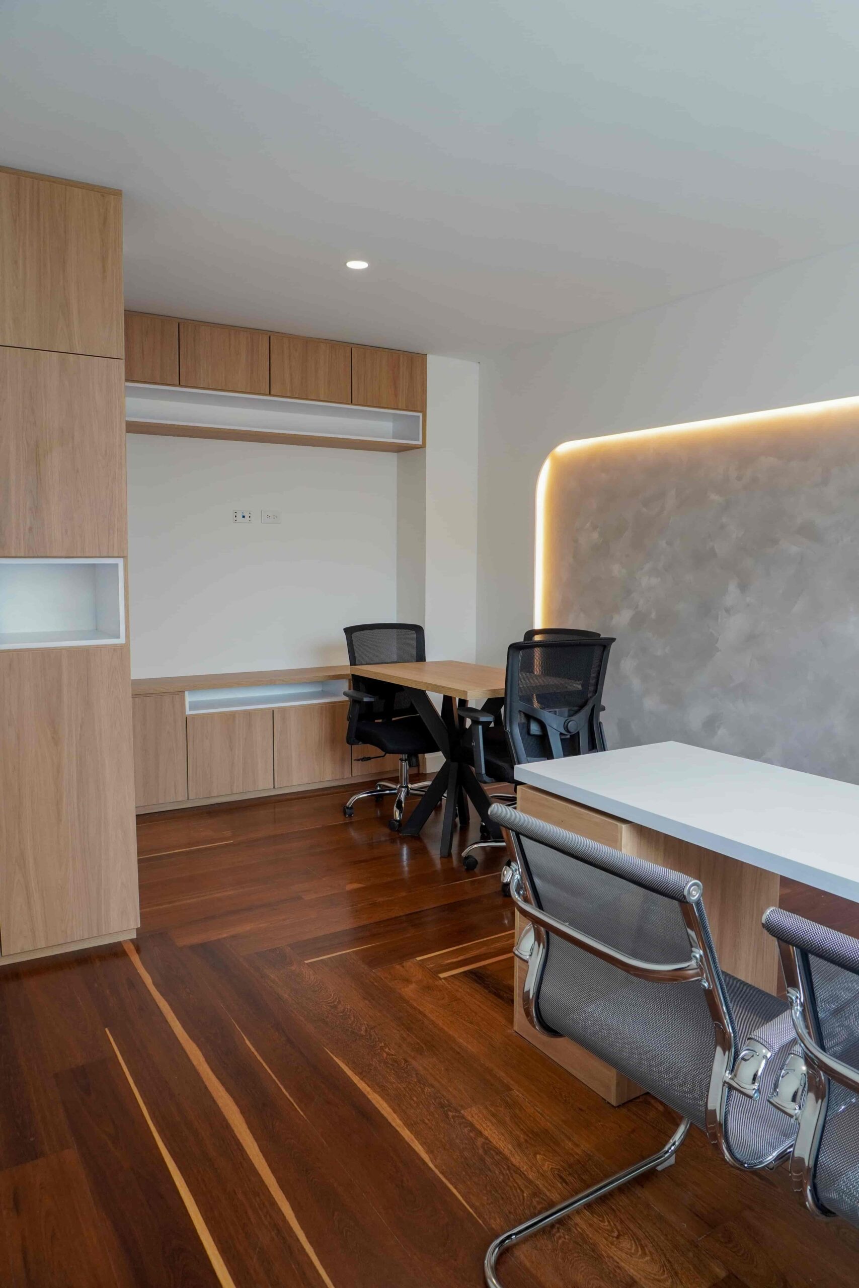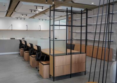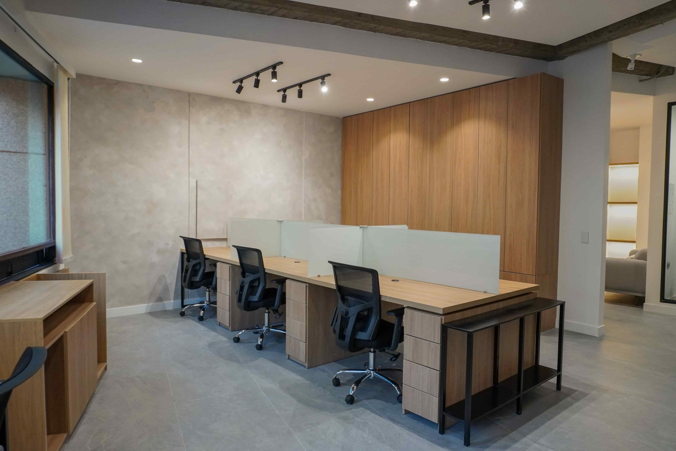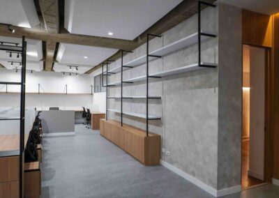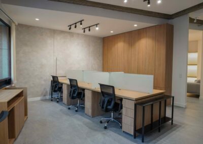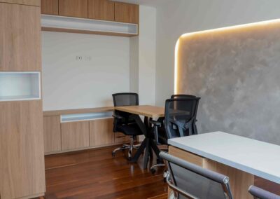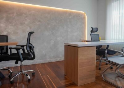 William y César soñaban con que su nueva oficina de geólogos fuera un reflejo de su identidad profesional: un espacio moderno, con carácter y lleno de simbolismo. El lugar que adquirieron tenía una distribución complicada, muros atravesados y ambientes muy oscuros. Desde el diseño de interiores se propuso un estilo industrial que aportara fuerza y autenticidad, acompañado de soluciones que dieran mayor amplitud y luz. Se planteó cambiar los pisos por porcelanato gris en gran formato, ideal para iluminar y modernizar el ambiente. Las salas excesivamente grandes se redistribuyeron para dar cabida a más oficinas y zonas de trabajo. Para aportar calidez, los muros se proyectaron con técnica lime wash en tonos grises y beige, mientras que el mobiliario en madera cálida y estructuras metálicas negras refuerzan la estética industrial. El gran gesto de identidad se diseñó en la recepción: una pared con grieta que deja ver una piedra natural, homenaje a la esencia de la geología.