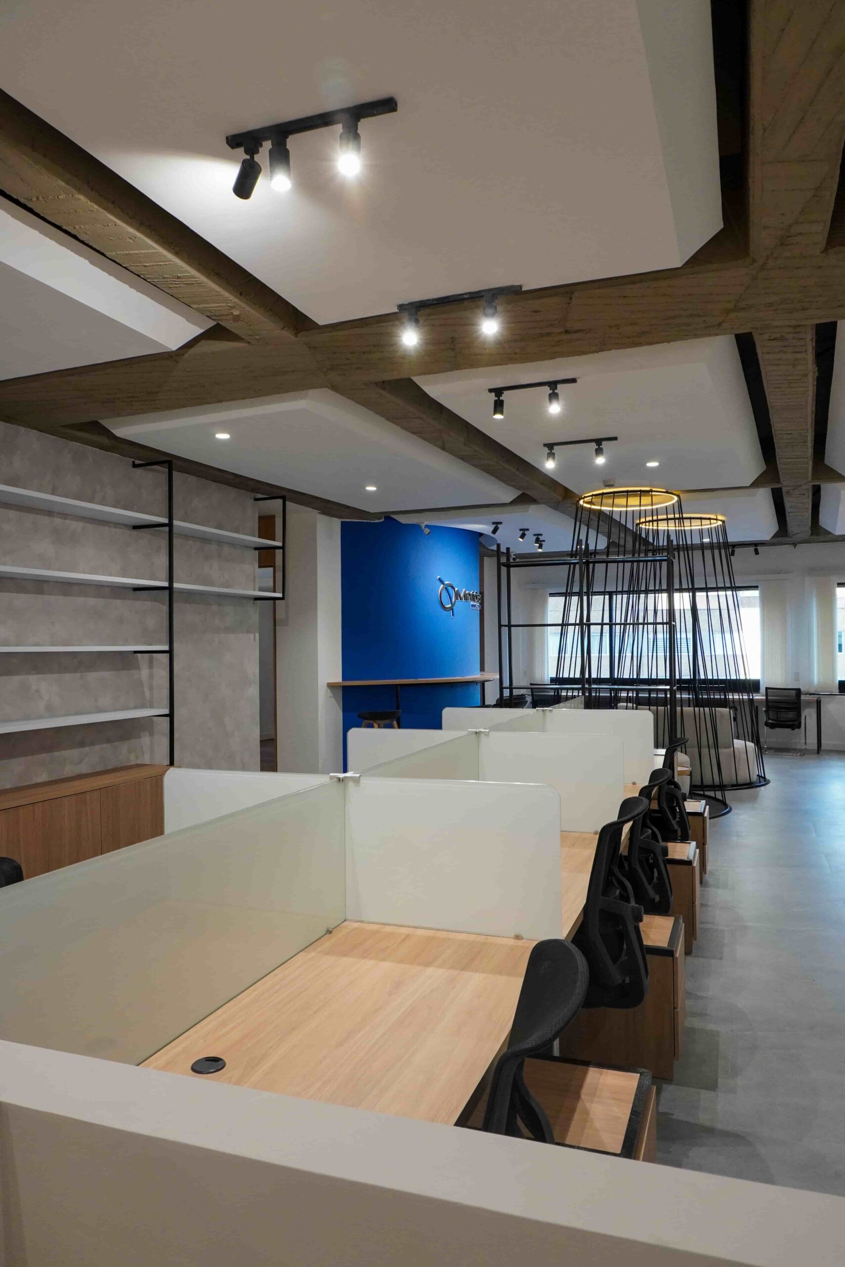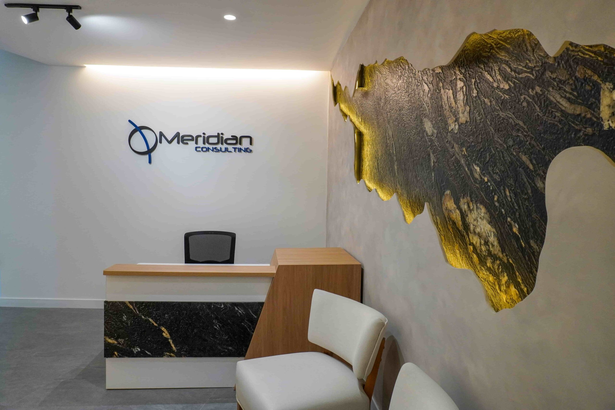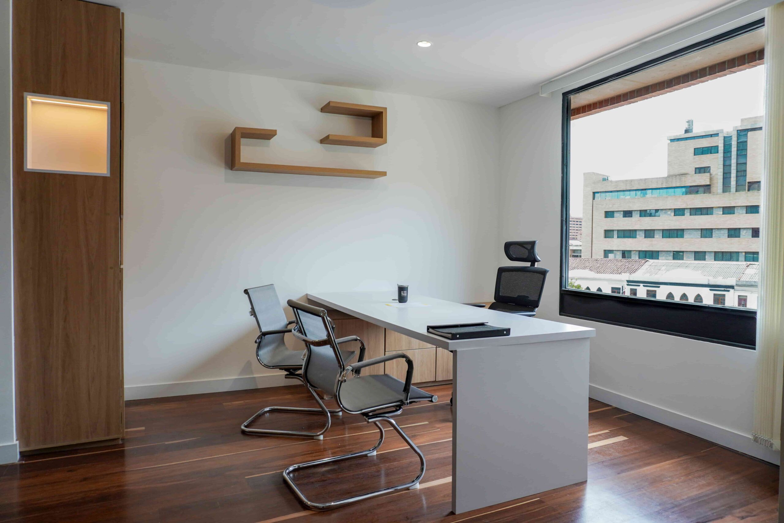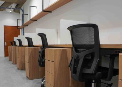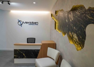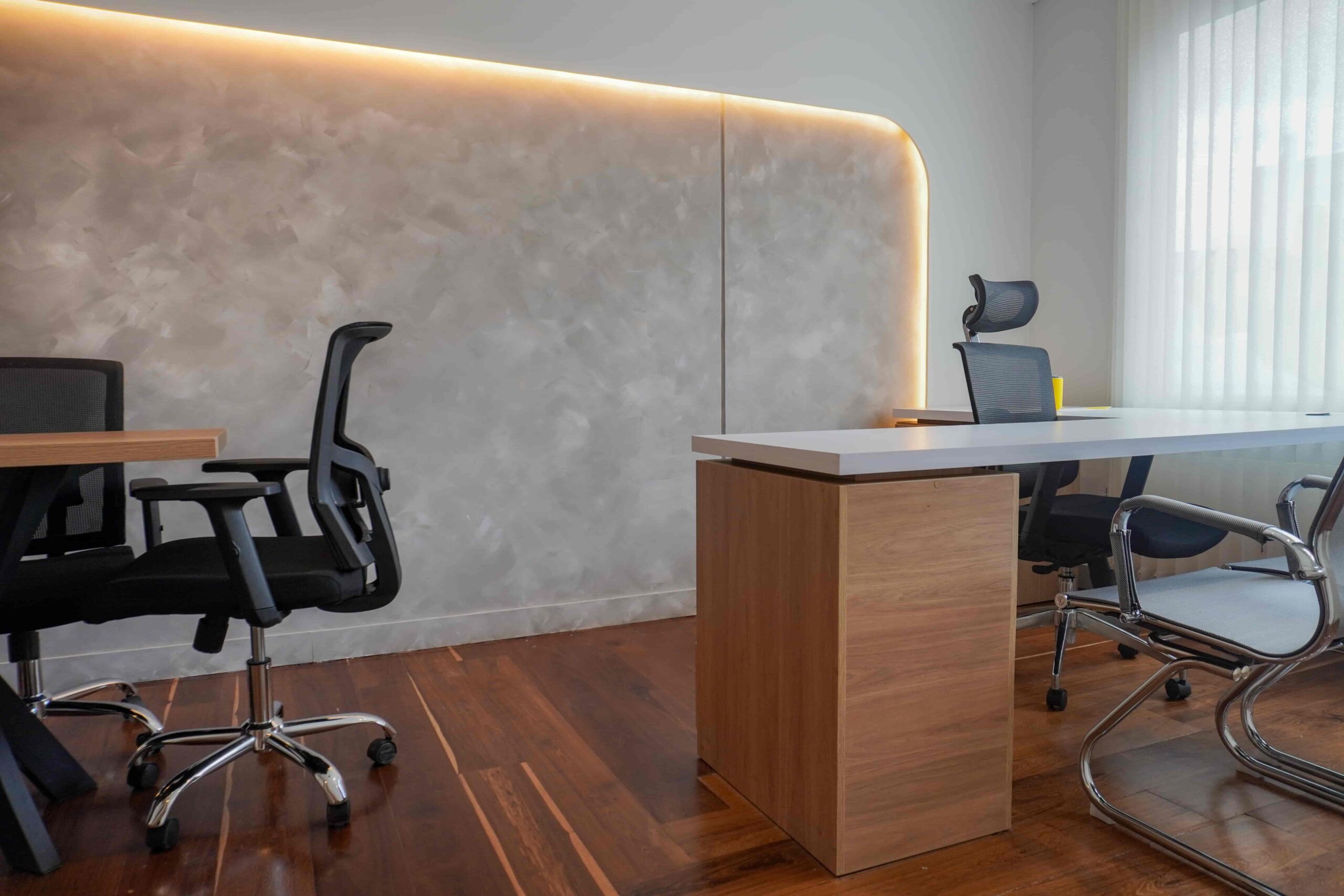 William y César soñaban con que su nueva oficina de geólogos fuera un reflejo de su identidad profesional: un espacio moderno, con carácter y lleno de simbolismo. El lugar que adquirieron tenía una distribución complicada, muros atravesados y ambientes muy oscuros. Desde el diseño de interiores se propuso un estilo industrial que aportara fuerza y autenticidad, acompañado de soluciones que dieran mayor amplitud y luz. Se planteó cambiar los pisos por porcelanato gris en gran formato, ideal para iluminar y modernizar el ambiente. Las salas excesivamente grandes se redistribuyeron para dar cabida a más oficinas y zonas de trabajo. Para aportar calidez, los muros se proyectaron con técnica lime wash en tonos grises y beige, mientras que el mobiliario en madera cálida y estructuras metálicas negras refuerzan la estética industrial. El gran gesto de identidad se diseñó en la recepción: una pared con grieta que deja ver una piedra natural, homenaje a la esencia de la geología.