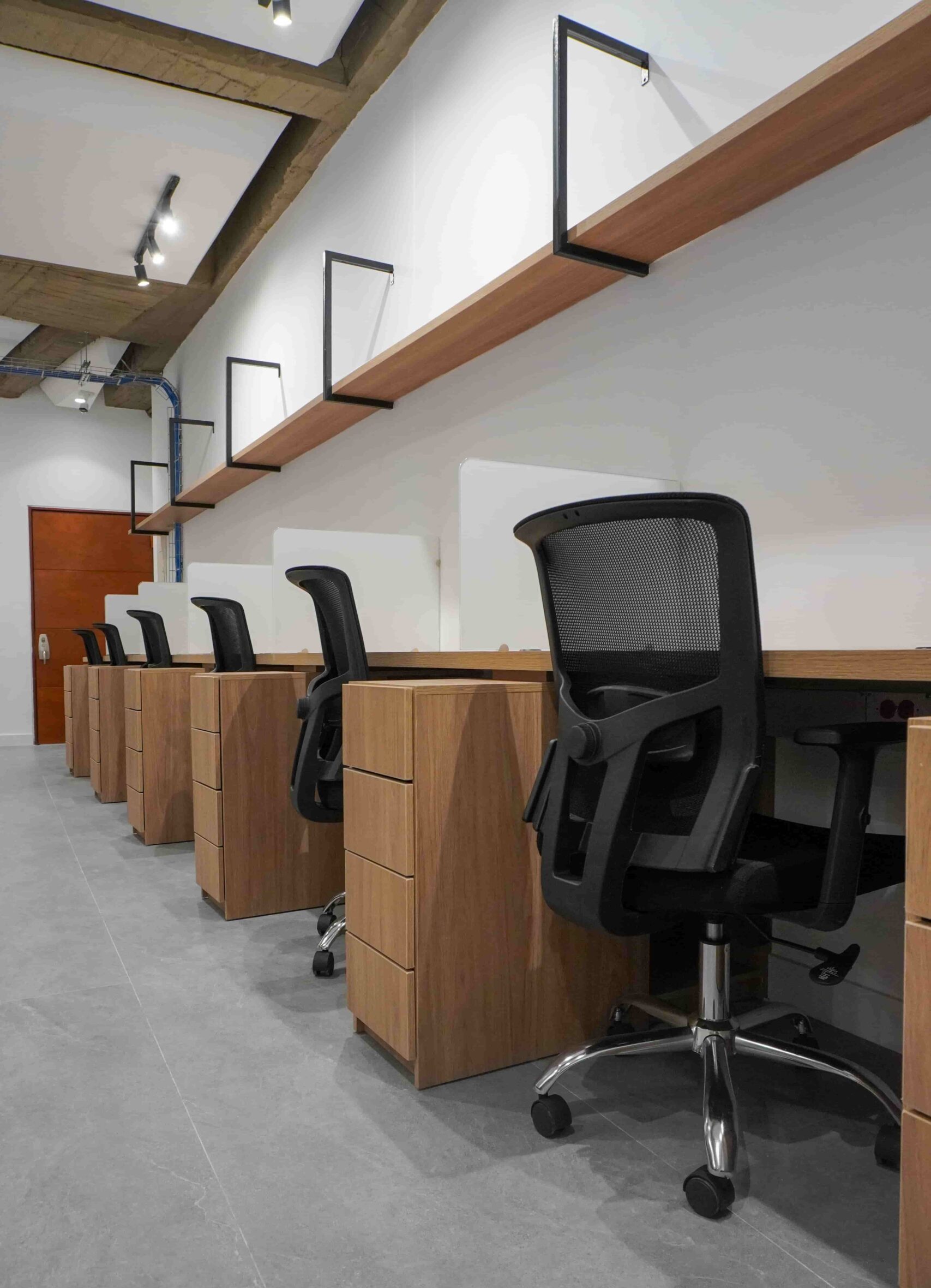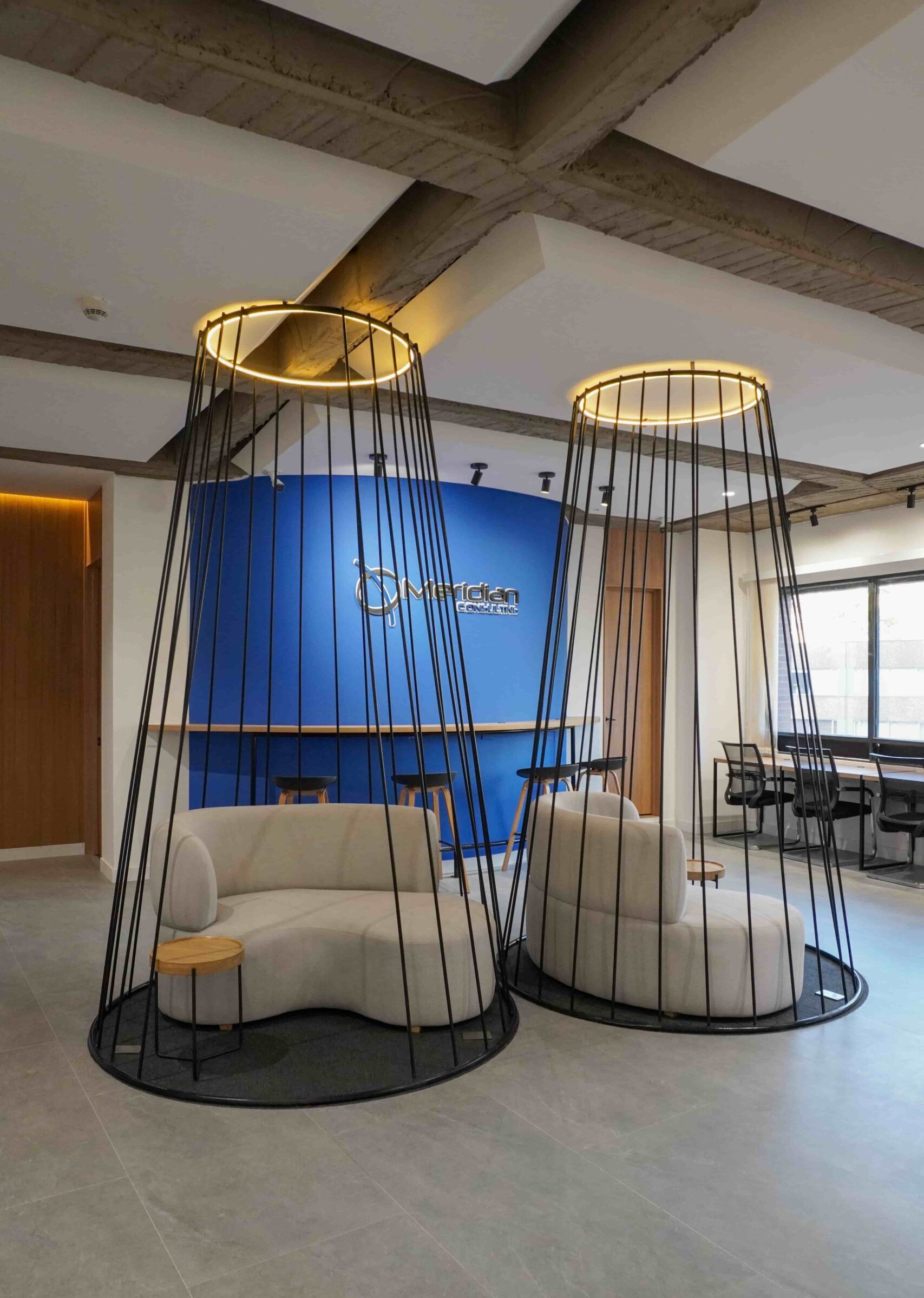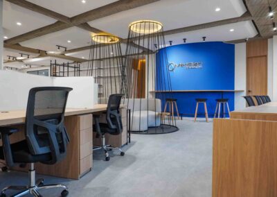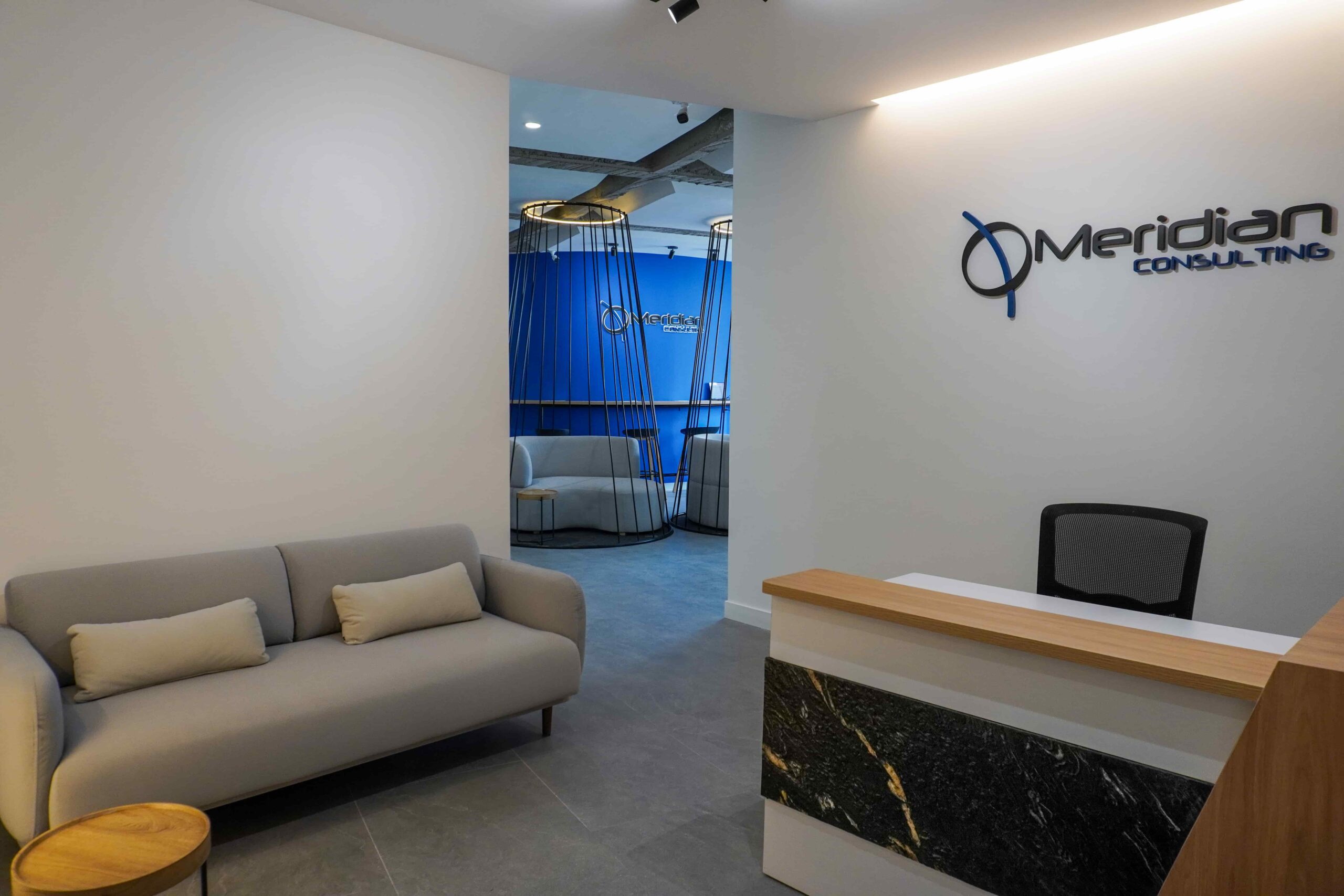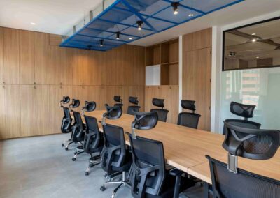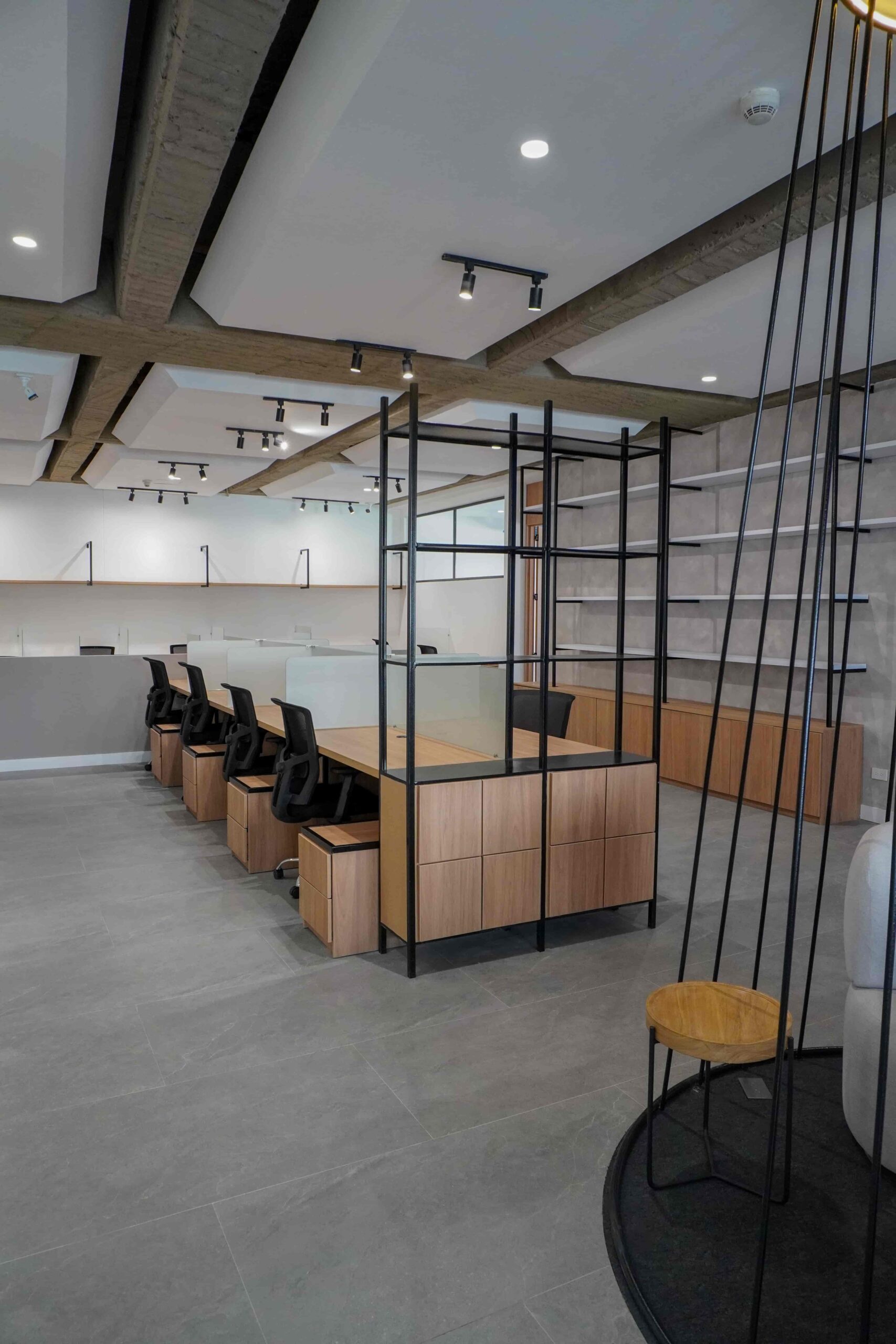 William y César soñaban con que su nueva oficina de geólogos fuera un reflejo de su identidad profesional: un espacio moderno, con carácter y lleno de simbolismo. El lugar que adquirieron tenía una distribución complicada, muros atravesados y ambientes muy oscuros. Desde el diseño de interiores se propuso un estilo industrial que aportara fuerza y autenticidad, acompañado de soluciones que dieran mayor amplitud y luz. Se planteó cambiar los pisos por porcelanato gris en gran formato, ideal para iluminar y modernizar el ambiente. Las salas excesivamente grandes se redistribuyeron para dar cabida a más oficinas y zonas de trabajo. Para aportar calidez, los muros se proyectaron con técnica lime wash en tonos grises y beige, mientras que el mobiliario en madera cálida y estructuras metálicas negras refuerzan la estética industrial. El gran gesto de identidad se diseñó en la recepción: una pared con grieta que deja ver una piedra natural, homenaje a la esencia de la geología.